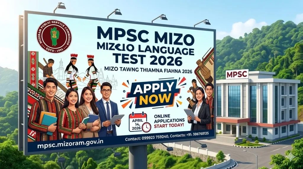 MPSC Mizo Language Test 2026 is officially open for applications. Mizoram Public Service Commission is conducting this qualifying test for MPSC job applicants who do not have Mizo Language Proficiency proof. Apply online at mpsconline.mizoram.gov.in before April 30, 2026.